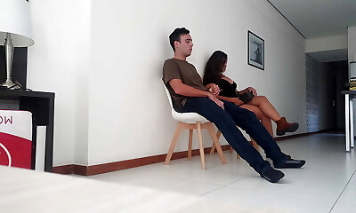 The girl from the apartment service at the rented apartment catches me providing me a hand job and helps me accomplish by giving me a blowjob