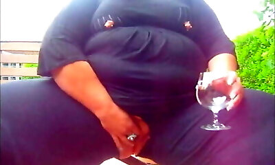 Very big lady peeing on a glasses