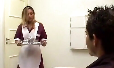 Stacked maid is going to work on his rock-hard dick in a taboo movie