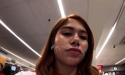 Pissing red haired woman Candy Red gives a blowjob in public and gets fucked indoor