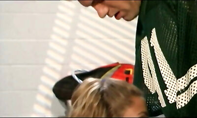 Blond teen cheerleader sucks jock’s pipe in locker room, then gets pulverized