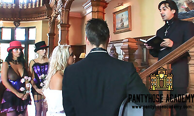 Cheating bride gets poked hard in all trio of her holes by studs at wedding