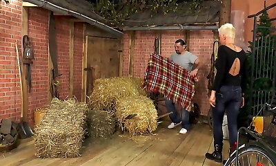 巨型丰满的公平头发的蜂蜜给了一个头,她的男人在户外