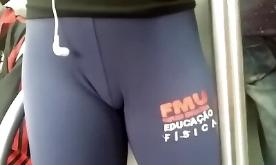 Teen cock-squeezing pussy in a short leggings with a big package to squeeze.