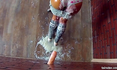 della bläst zart und präzise einen fremden's mann wurst durch eine dusche, in einer petite toilette
