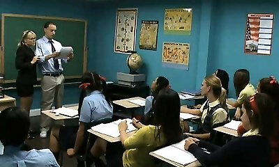 un éducateur de luxe en collants à talons hauts donne du travail à la main à une étudiante