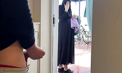 SCARED BUT CURIOUS! Muslim preggie neighbour in niqab caught me jerking off and asked me to let her touch my uncut dick